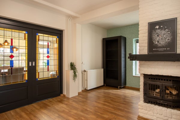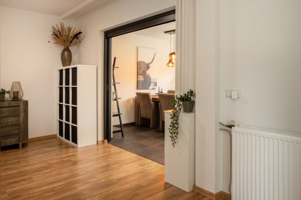 Via de ruime hal/entree met tegelvloer betreedt u de woning. Hier bevinden zich de trapopgang, meterkast, trapkast, een hangend toilet met fonteintje en een praktische garderobenis. Vanuit de hal heeft u toegang tot de woonkamer. De woonkamer is ruim en licht dankzij de grote raampartijen aan de voorzijde. De ruimte is afgewerkt met stucwerkwanden en plafonds en een laminaatvloer. De houtkachel vormt een sfeervol middelpunt in de kamer en creëert daarnaast een gezellige extra hoek, ideaal als speelhoek, studieplek of thuiswerkplek.