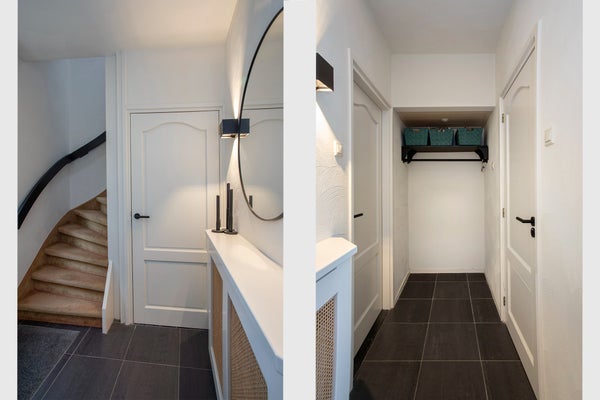 De overloop geeft toegang tot twee slaapkamers, de badkamer en de vaste trap naar de tweede verdieping. Onder de trap zijn de aansluitingen voor wasmachine en droger netjes weggewerkt.