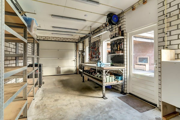 Via de tuin is de garage bereikbaar. Deze is aan de buitenzijde fraai gepotdekseld en sluit perfect aan bij de stijl van de overkappingen. De garage is royaal van opzet en ideaal voor opslag, hobby’s of het plaatsen van een werkbank. De ruimte beschikt over een wasbak met kraan, hardhouten raamkozijnen voor daglicht, een aparte stoppenkast, krachtstroom en de omvormer van de zonnepanelen. Aan de voorzijde, tegen de woning aan, bevindt zich bovendien een carport waar je de auto droog kunt parkeren.