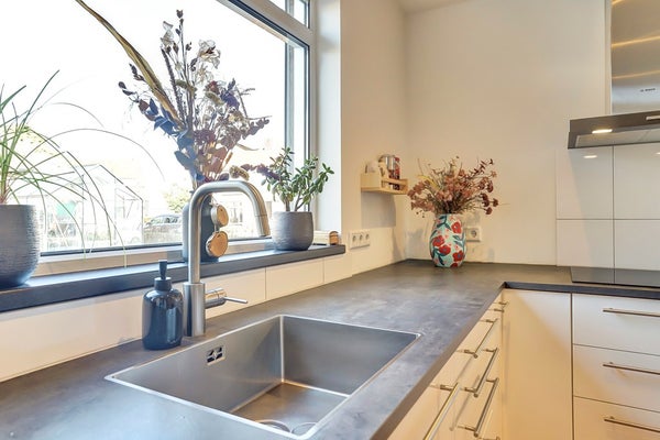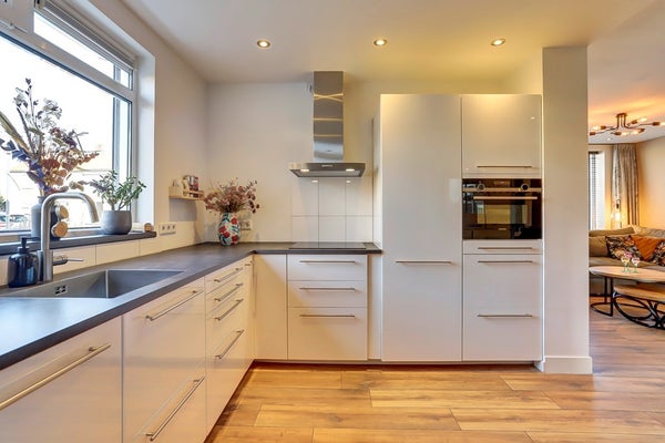 Centraal in de woonkamer bevindt zich de keuken. Deze is opgesteld in een praktische L-opstelling en uitgevoerd met lichte kasten en een donker werkblad. De keuken beschikt over een 4-pits inductiekookplaat, een afzuigkap, een vaatwasser, een spoelbak met mengkraan, een combimagnetron en een koelkast. Een fijne, degelijke en functionele keuken met volop werk- en bergruimte