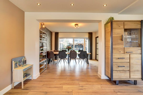 Wat een heerlijke ruimte om te verblijven. De woonkamer is fraai afgewerkt met een prachtige houtlook tegelvloer met vloerverwarming, strakke wanden en plafonds. Voorin de woonkamer is ruimte voor een gezellige zithoek voorzien van grote raampartij wat zorgt voor veel daglicht in de ruimte. In het middelste gedeelte is er genoeg ruimte voor een speelhoek voor de kinderen. In de royale aanbouw aan de achterzijde is er genoeg ruimte voor een 8-persoons tafel wat ideaal is voor te borrelen of te eten met familie en vrienden. Middels schuifpui heb je direct toegang tot de achtertuin.