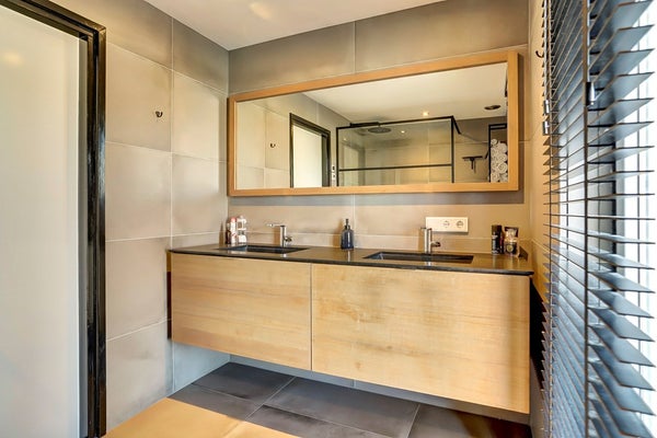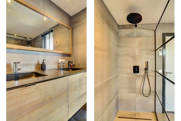 De badkamer is uitgevoerd als een luxe ruimte en is volledig betegeld. Zo beschikt de badkamer over vloerverwarming, een zeer royale inloopdouche met glazen wand, een groot badmeubel met dubbele wastafel en dubbele mengkranen. Daarnaast is de badkamer voorzien van mechanische ventilatie.