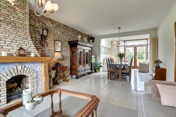 Vanuit de keuken is de woonkamer te bereiken. De woonkamer is met een diepte van ca. 11m royaal van opzet waardoor veel indelingen mogelijk zijn. De kamer is uitgevoerd met een prachtige tegelvloer, witte wand- en plafondafwerking. De kamer is ondanks de grootte ook erg knus en gezellig door de vele extra's. Ideaal om met de familie rond de gashaard te vertoeven of in de tweede zithoek aan de achterzijde van de fluitende vogeltjes in de tuin te genieten. De grote raampartijen en lichtstraat zorgen voor tenslotte veel daglichttoetreding waardoor de lampen elke dag pas laat aan hoeven.