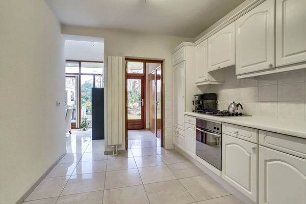 Daarnaast is er vanuit de keuken directe toegang tot het achterportaal, waar je twee handige inbouwkasten en de achterdeur naar de achtertuin kunt vinden.