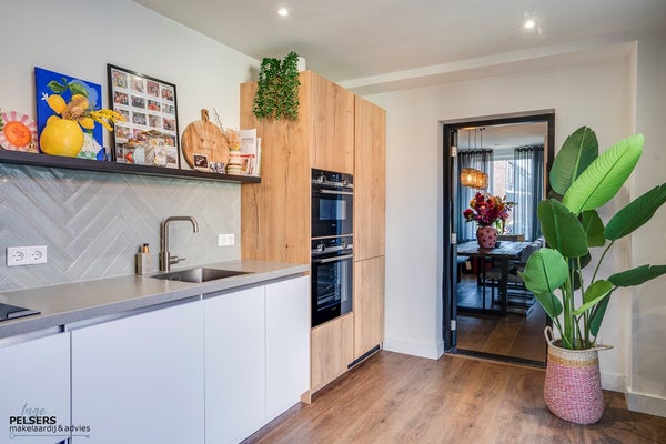 Aansluitend aan de woonkamer bevindt zich de moderne keuken, strak uitgevoerd en praktisch ingedeeld. De sfeervolle, mooie keuken (2022) is voorzien van diverse inbouwapparatuur en biedt volop werk- en bergruimte.