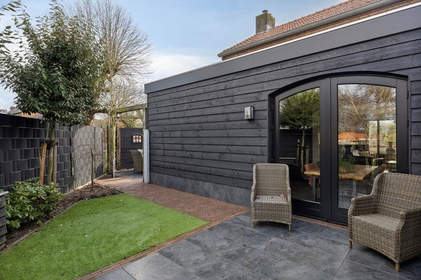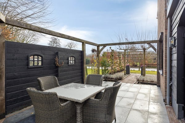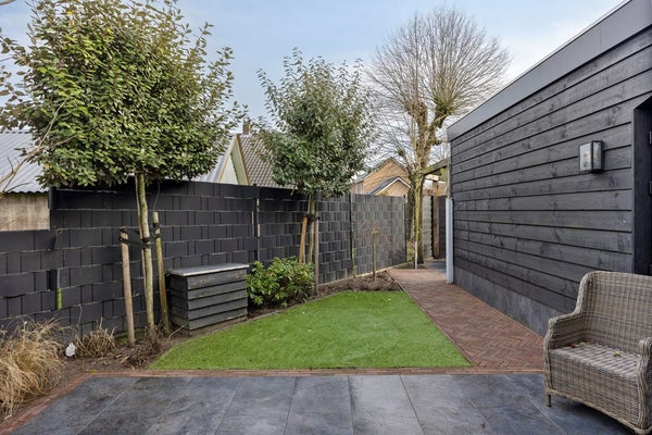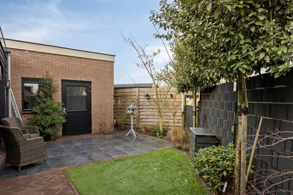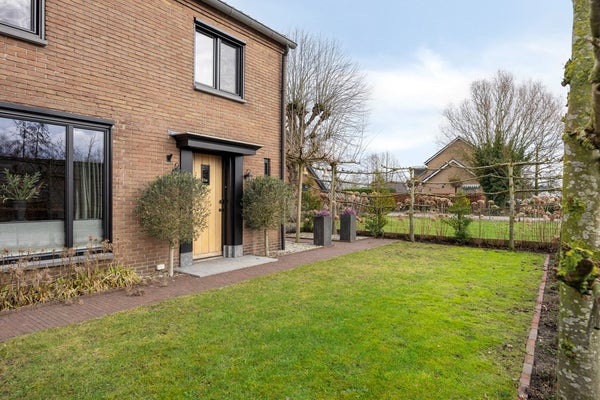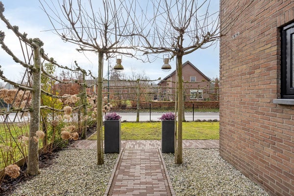 De tuin rondom is onderhoudsvriendelijk aangelegd met bestrating, (kunst)gras en vaste beplanting. Meerdere zitplekken maken het mogelijk om op elk moment van de dag een fijne plek in de zon of schaduw te kiezen. De zwarte houten gevelbekleding van de aanbouw geeft de tuin een eigentijdse uitstraling en zorgt voor een stijlvolle overgang tussen woning en buitenruimte. Aangrenzend bevindt zich de dubbele garage met veel bergruimte en mogelijkheden voor hobby of werk aan huis. Aan de voorzijde beschikt u over een royale, afsluitbare oprit, waar u met gemak meerdere auto’s parkeert.