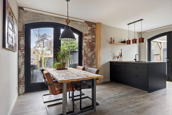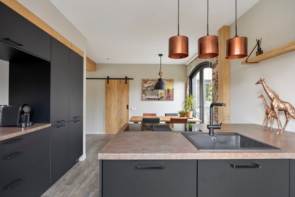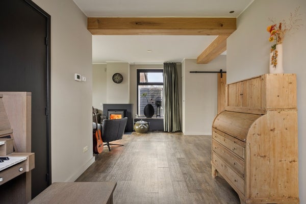De woonkamer ligt aan de voorzijde en voelt direct warm en uitnodigend aan. Grote ramen zorgen voor een aangename lichtinval, terwijl de sfeervolle haard het natuurlijke middelpunt vormt van de zithoek. Hier ontstaat vanzelf een plek waar u ’s avonds neerstrijkt en waar bezoek zich direct thuis voelt. Richting de achterzijde gaat de ruimte vloeiend over in het eetgedeelte en de open keuken. Het kookeiland vormt een stoer en eigentijds accent, met volop werk- en kastruimte. De opstelling is compleet uitgevoerd met een inductiekookplaat met geïntegreerde afzuiging, combi-oven, vaatwasser en koelkast. Openslaande deuren verbinden het interieur met het terras, waardoor binnen en buiten op een natuurlijke manier samenkomen.