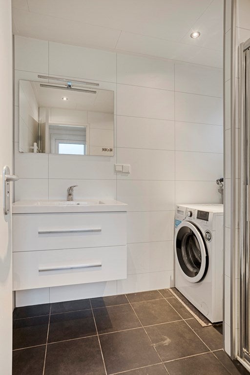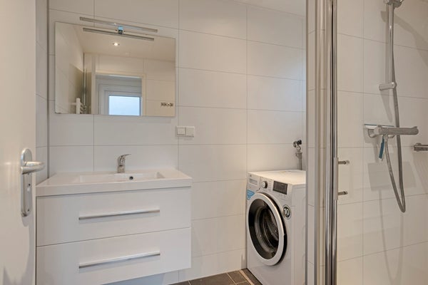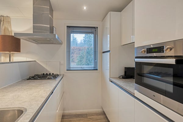 De keuken is strak uitgevoerd en voorzien van moderne inbouwapparatuur zoals een gaskookplaat, afzuigkap, combi-oven, koelkast en een vaatwasser. Daarnaast is er voldoende werk- en bergruimte. Vanuit de woonkamer is er direct toegang tot de overdekte veranda, waardoor binnen en buiten moeiteloos in elkaar overlopen.