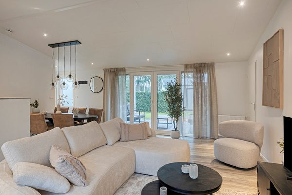 Via de entree stapt u binnen in een lichte en prettig ingedeelde bungalow. De woonkamer vormt samen met de eetruimte een open leefgedeelte, waar grote ramen zorgen voor een fijne lichtinval en zicht op het groen rondom. De zithoek is ruim genoeg voor een comfortabele opstelling en sluit logisch aan op de eethoek en de open keuken.