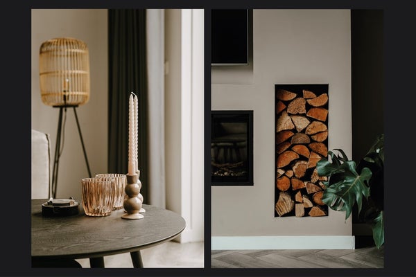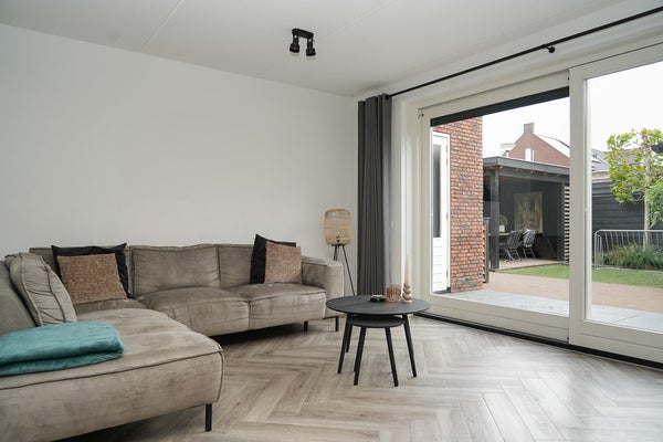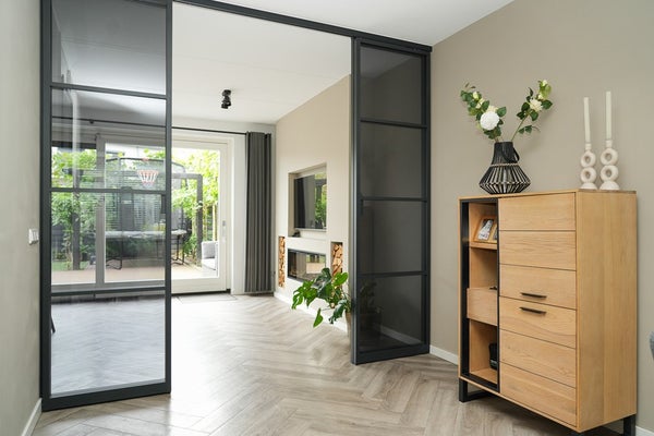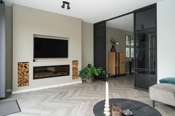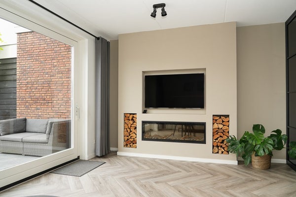 De woonkamer is strak afgewerkt en voorzien van een sfeervolle gashaard en schuifpui naar de achtertuin.
