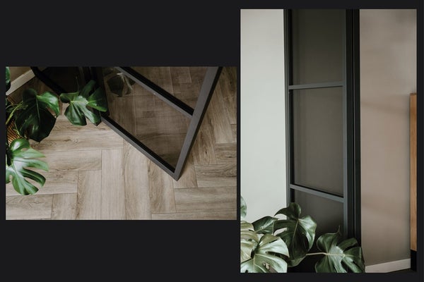 De keuken en woonkamer worden van elkaar gescheiden door een zwart aluminium frame met rookglas—een fraaie blikvanger.