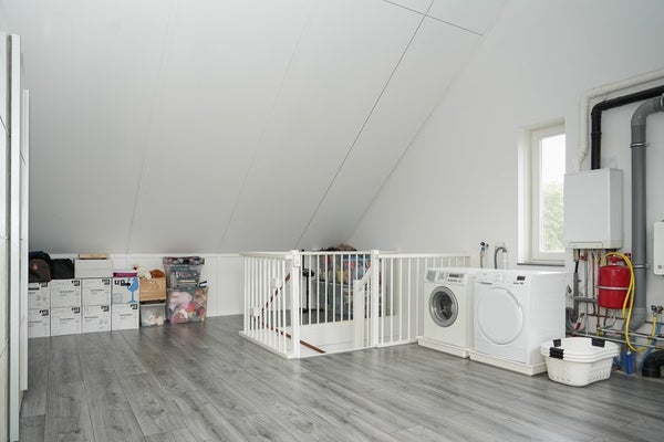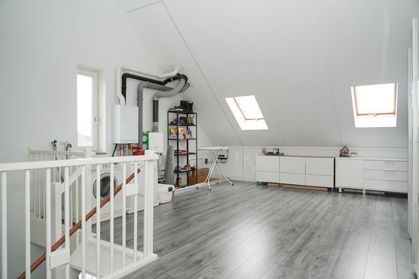 De grote zolder heeft een nokhoogte van maar liefst 4,12 meter en een oppervlakte van 36 m2. Op deze verdieping kunnen met gemak twee extra slaapkamers worden gerealiseerd. Op deze verdieping vind je de wasmachine en droger, CV-ketel en de mechanische ventilatie en een zee van ruimte. Door de dakramen is het licht.