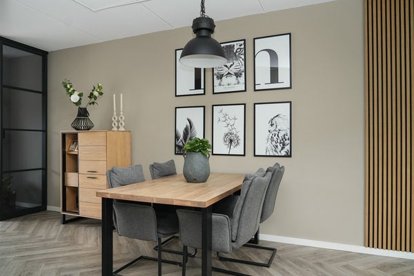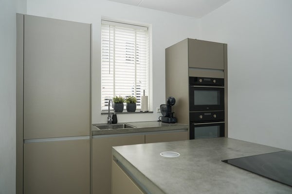 Een stijlvolle, zwarte aluminium tussendeur brengt je naar de eetkeuken. De keuken ligt aan de voorzijde van de woning en is uitgevoerd met een kookeiland met een robuust betonnen werkblad en een wandmeubel. Dankzij het zijraam en de ramen aan de voorzijde valt het daglicht mooi naar binnen.