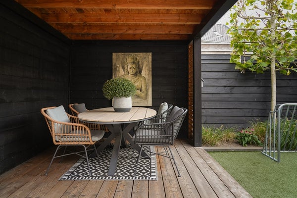 Onder de overkapping zit je heerlijk beschut: een fijne plek om tot rust te komen.