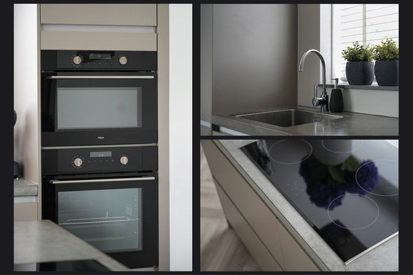 De keuken heeft een rustige uitstraling en is uitgevoerd met alle benodigde inbouwapparatuur: een koelkast, combimagnetron, vaatwasser, oven, inductie kookplaat, afzuigkap en opbergruimte in de lades en kasten.