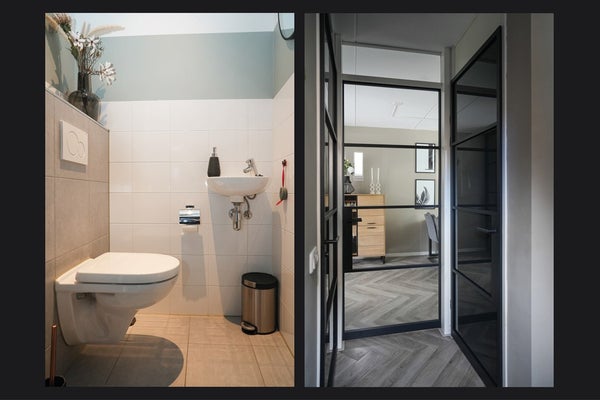 De entree bevindt zich aan de zijkant van de woning. Vanuit de hal heb je toegang tot het toilet met fonteintje, de meterkast, trapopgang naar de eerste verdieping en keuken. Ook is er een praktische trapkast met extra bergruimte. De begane grond is strak afgewerkt met een PVC-vloer en comfortabele vloerverwarming.