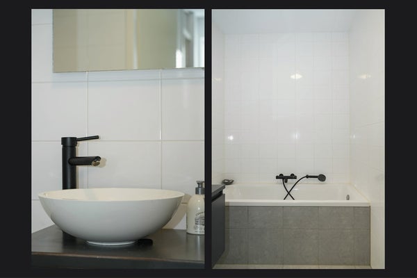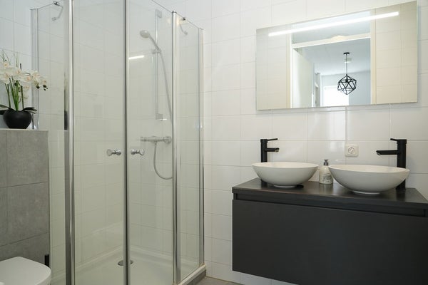 De badkamer is uitgevoerd in een tijdloze combinatie van wit en zandkleurig tegelwerk. Hier vind je een douchecabine, ligbad, dubbele wastafel met waskommen, wandcloset en een handdoekradiator. De ruimte is mechanisch geventileerd.