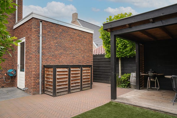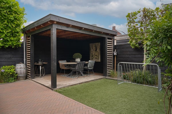 Via de houten poort kom je in de achtertuin, deze ligt op het noordoosten en wordt omringd door een donkere houten schutting. De tuin is in 2023 opnieuw aangelegd en biedt een bestraat terras aansluitend aan de achtergevel, een stukje (kunst)gras en beplanting langs het perceel en langs de pergola.