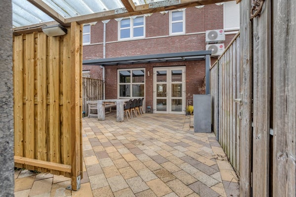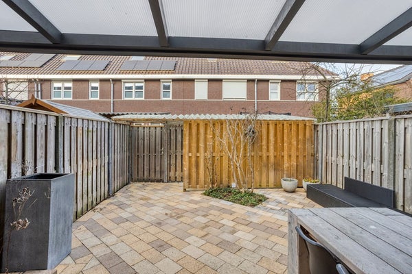 De tuin, gesitueerd op het Zuid-Westen, is volledig beklinkerd en voorzien van een fraaie overkapping, een houten stalling en een handige achterom. Een ideale plek om te ontspannen en buiten te eten.
