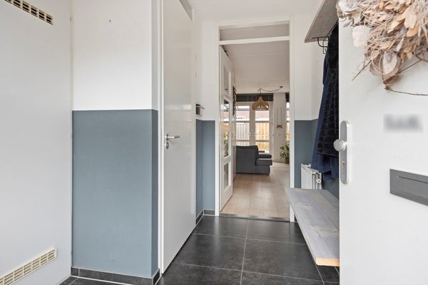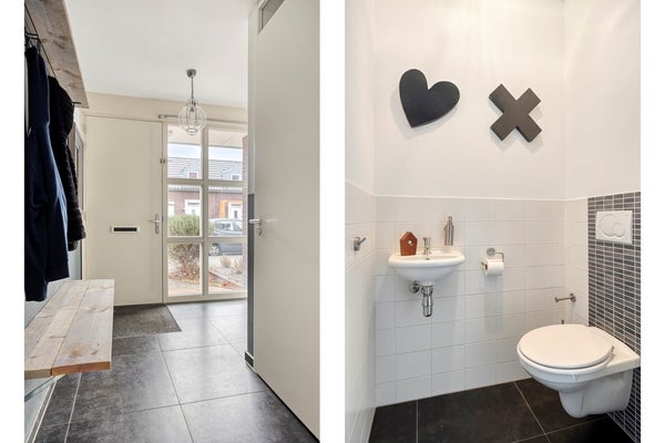 Bij binnenkomst word je verwelkomd in een lichte entree/hal met tegelvloer, garderobe en een modern toilet.