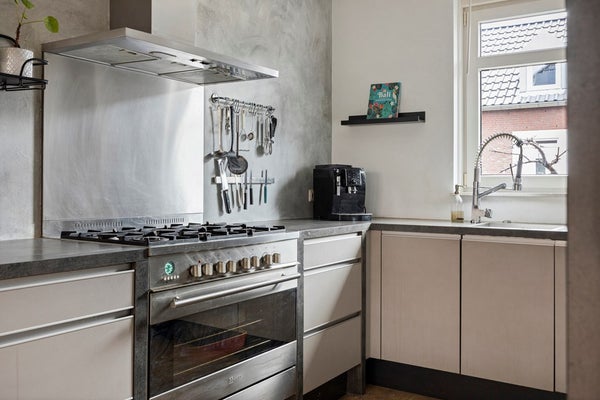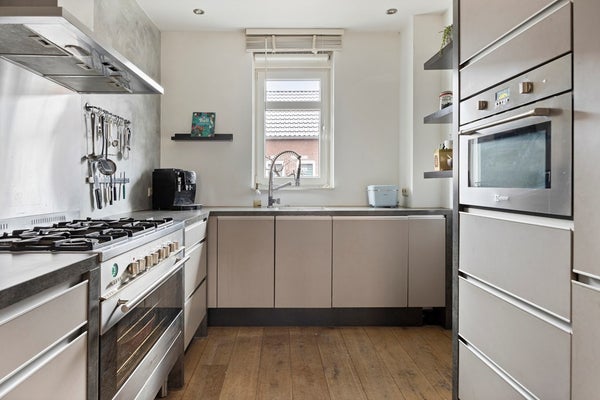 De half-open keuken sluit naadloos aan en is modern ingericht met een 6-pits gasfornuis, afzuigkap, combi-oven, vaatwasser, koelkast en vrieskast. De keuken biedt bovendien veel kast- en bergruimte, waardoor koken en opbergen hier bijzonder prettig is.