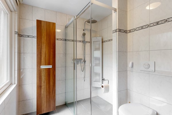 De mooie badkamer is gedeeltelijk betegeld en beschikt over een ruime inloopdouche met sunshower, een wastafel met opberglades, een design radiator en een extra toilet.