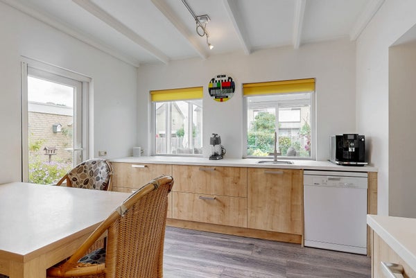 De aanbouwkeuken is van alle gemakken voorzien: een inductiekookplaat, oven, afzuigkap, koelkast, vriezer en vaatwasser. De tegelvloer met houtlook geeft een warme uitstraling. Hier sta je gegarandeerd fluitend te koken. In deze keuken is er genoeg opbergruimte voor alle servies en pannen, etenswaren en voorraad. Er is ook voldoende plaats voor een tafel met stoelen waar je elke ochtend met een kopje koffie en de krant rustig de dag kunt opstarten.