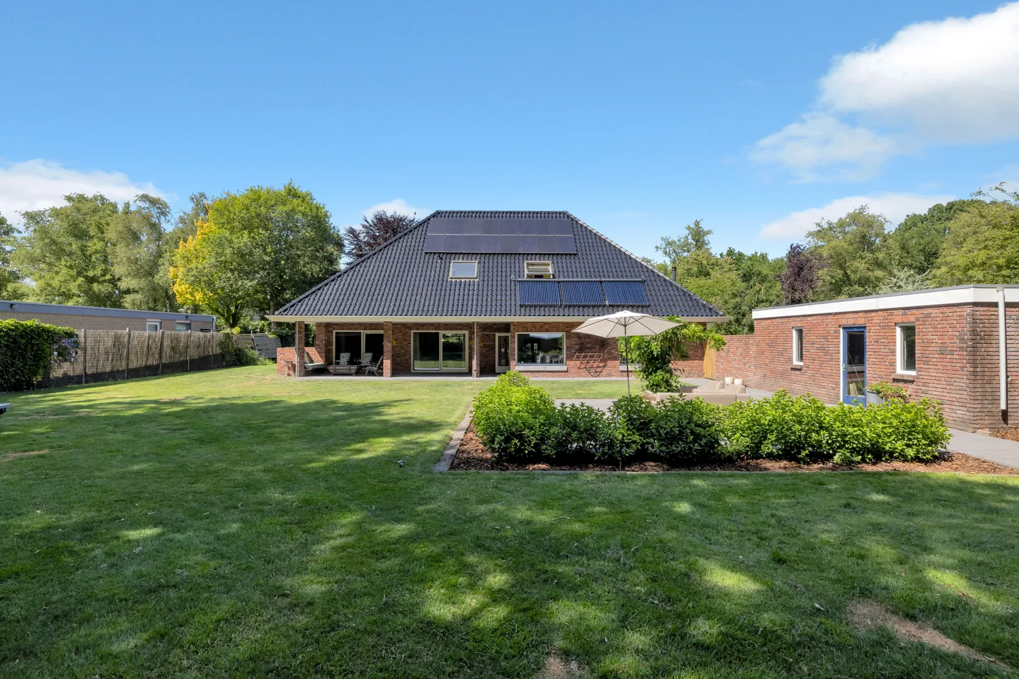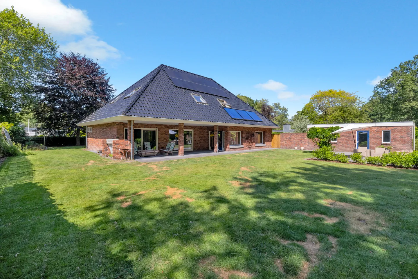 Wonen in Rolde betekent genieten van deze vrijstaande villa met energielabel A+. Deze royale villa van ca. 347 m² biedt maar liefst 7 slaapkamers, een kantoorruimte en een ruime woonkeuken van ca. 55 m², die uitnodigt tot fijne momenten met openslaande deuren naar de veranda van ca. 33 m². Op de begane grond bevindt zich een slaapkamer met badkamer, ideaal voor levensloopbestendig wonen, en een lichte doorzonwoonkamer van ca. 40 m². De eerste verdieping heeft een grote overloop en 6 slaapkamers, waarvan 5 met inloopkasten. De tuin op het zuiden is prachtig aangelegd en biedt privacy. Met een garage van 40 m² en een ruime oprit is deze woning perfect voor grote gezinnen en biedt ze volop mogelijkheden voor werk en ontspanning.