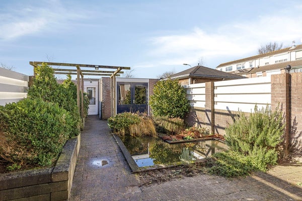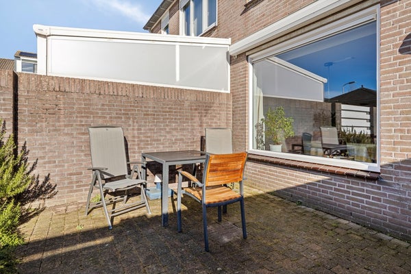 De achtertuin grenst aan zowel een parkeerterrein als een speelplaatsje, wat zorgt voor praktisch gemak en een kindvriendelijke setting.