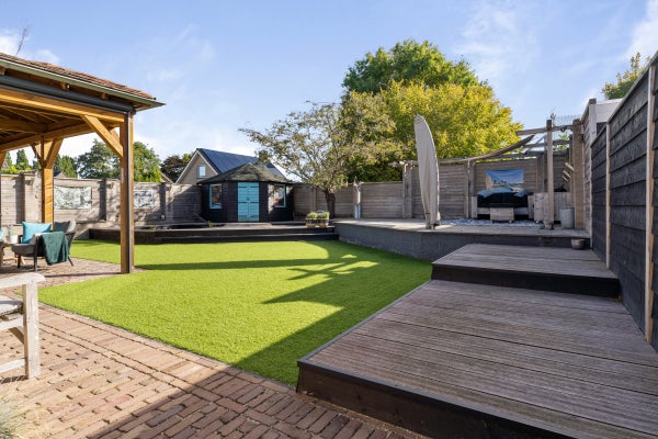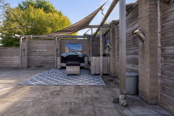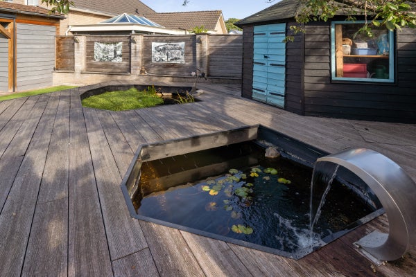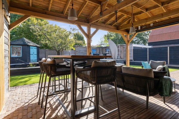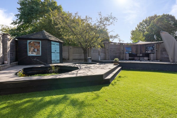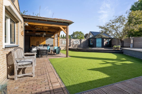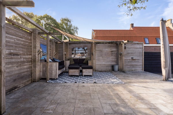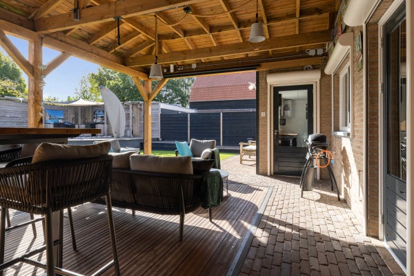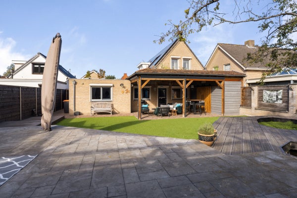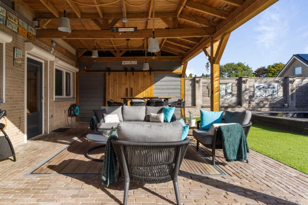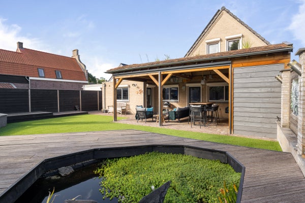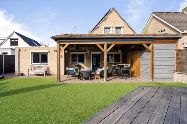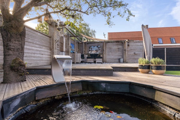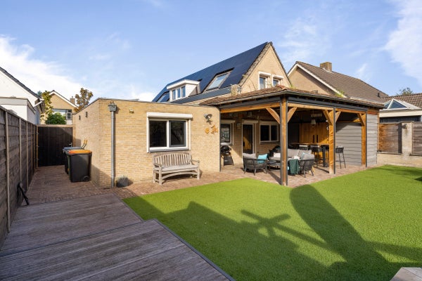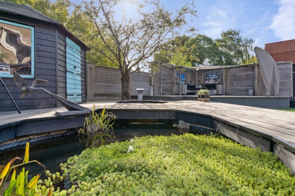 De achtertuin is speels aangelegd met een overkapping van 40 m², vijverpartij en een vrijstaande houten schuur.