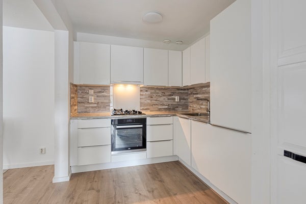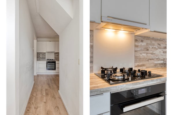 • De half open L-vormige keuken is voorzien van verschillend inbouwapparatuur: gaskookplaat, afzuigkap, koel-/vriescombinatie, combimagnetron, vaatwasser.