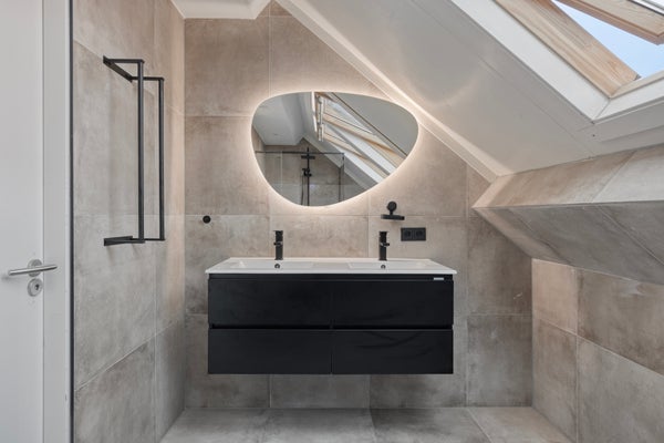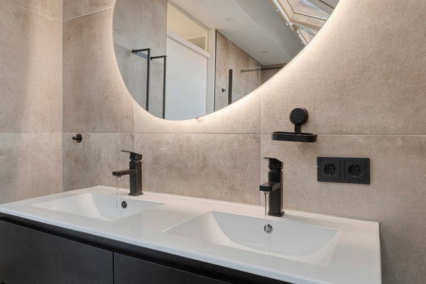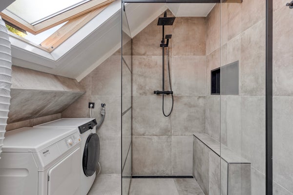 • Geheel betegelde badkamer welke is voorzien van een douchecabine, een dubbele wastafelmeubel, en vloerverwarming.