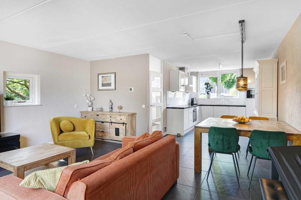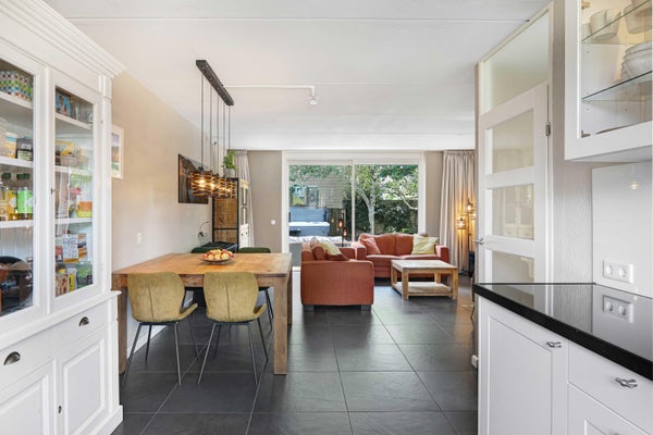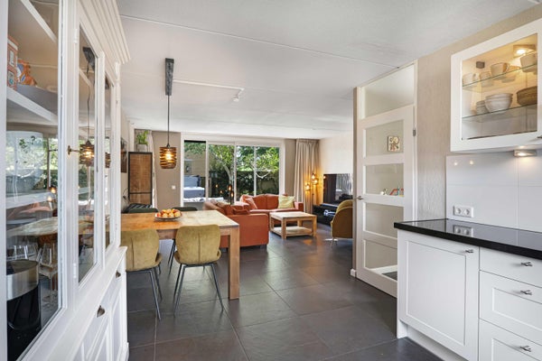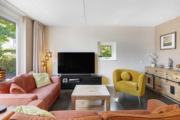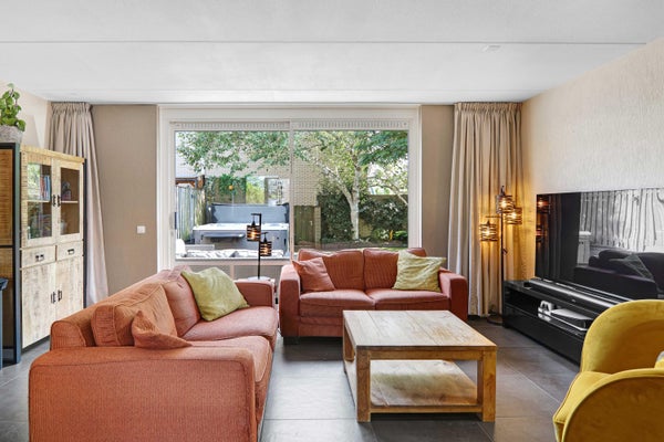 De woonkamer is ruim, strak afgewerkt en biedt directe toegang tot de zonnige achtertuin.