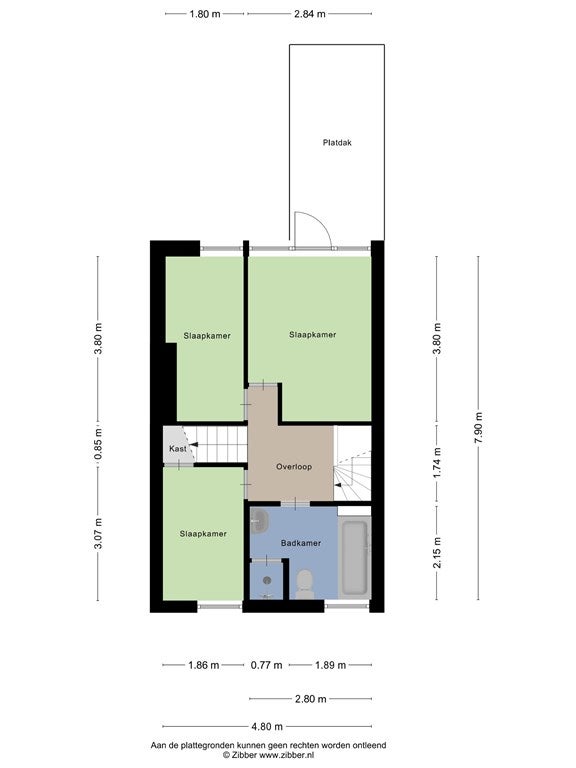 Overloop met toegang tot drie slaapkamers en een badkamer. Aan de voorzijde bevindt zich de badkamer met douche en ligbad. De master bedroom ligt aan de achterzijde, is voorzien van een vaste kast én biedt toegang tot een balkon. De andere twee slaapkamers liggen aan de voorzijde van de woning en achterzijde.