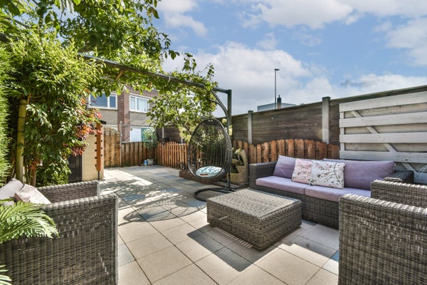Fraai aangelegde achtertuin op het zuiden (gehele dag zon) met elektrische zonneluifel, vrijstaande berging en achterom.
