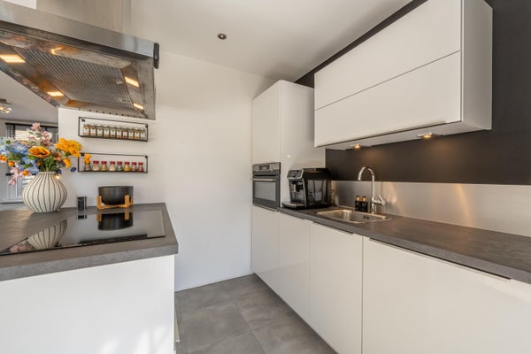 Daarnaast is er een moderne badkamer met inloopdouche, wastafelmeubel, toilet, design radiator, spots en muziekspeaker. De aparte wasruimte is praktisch ingericht met wasmachine- en drogeropstellingen en de cv-ketel.