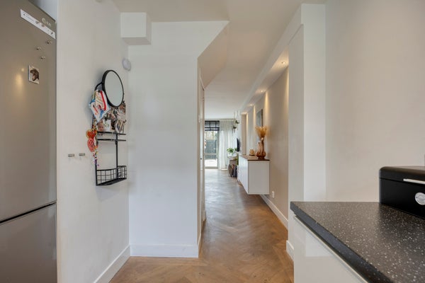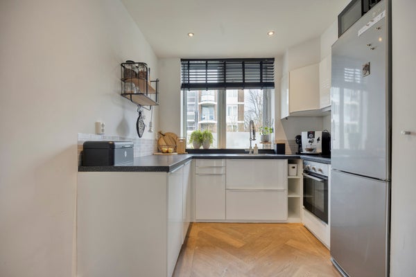 De woonkamer is aan de voorzijde voorzien van een half open keuken. De keuken is uitgevoerd in een neutrale kleur en is voorzien van een spoelbak met kraan, oven, vaatwasser, inductiekookplaat en een afzuigkap. Tevens is de keuken voorzien voldoende lades en kastruimte en is er ook een trapkast aanwezig.