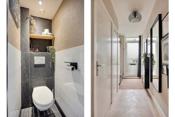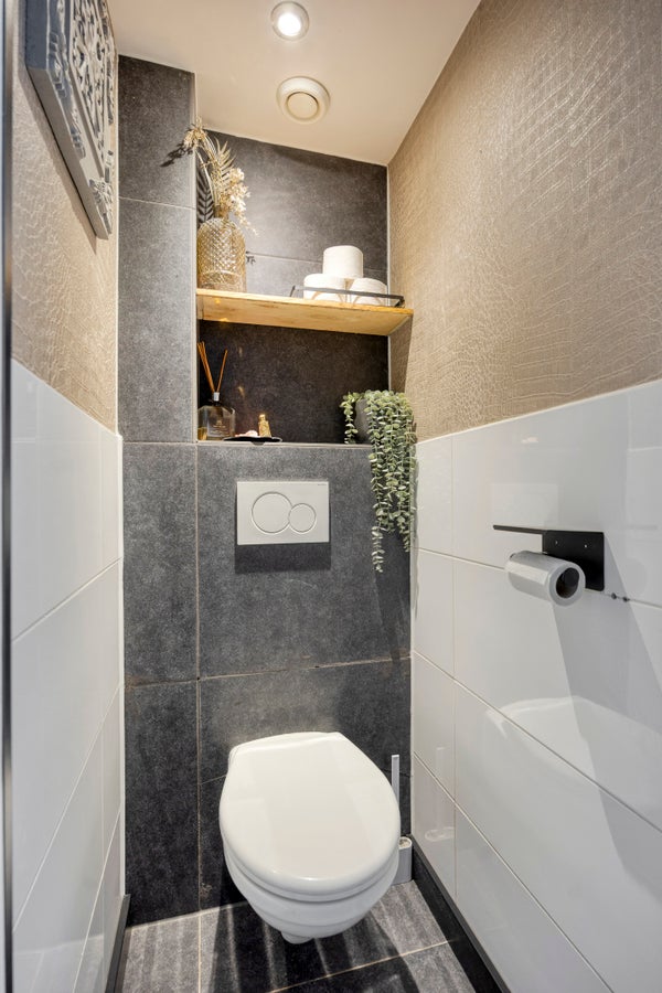 Deels betegeld toilet met zwevend closet.