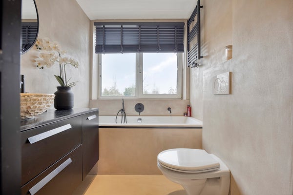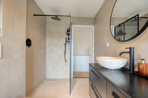 De badkamer is tevens gelegen aan de achterzijde van de woning en is voorzien van een ligbad, inloopdouche (Regendouche), wastafelmeubel, toilet en beton gestucte wanden en plafond.