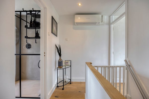 Overloop met airco en toegang tot twee slaapkamers, badkamer en vaste trap naar de zolderverdieping.