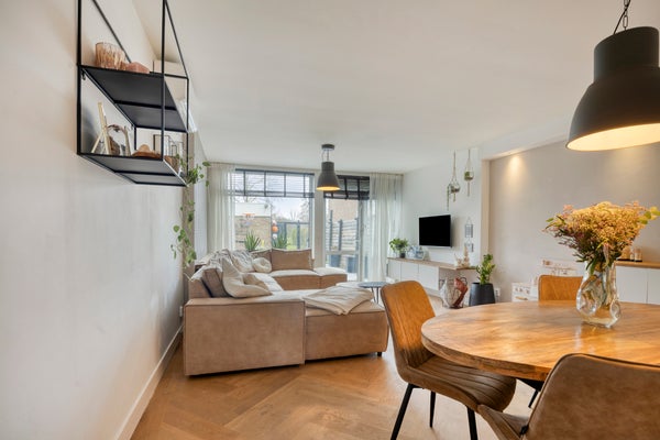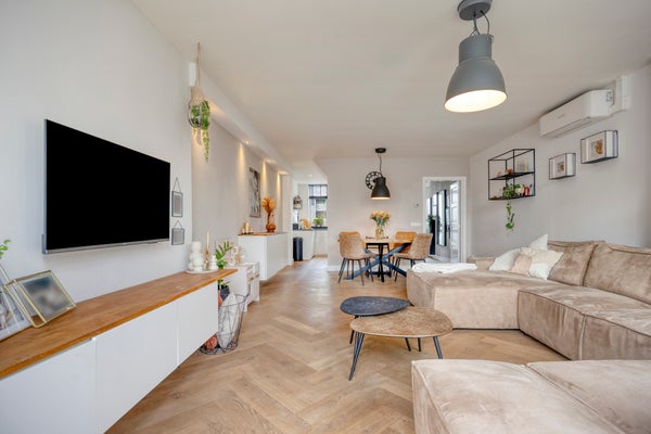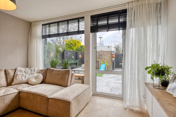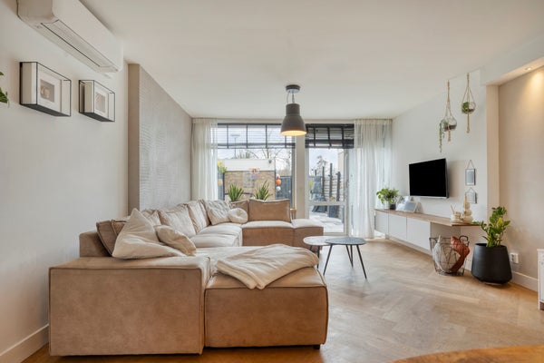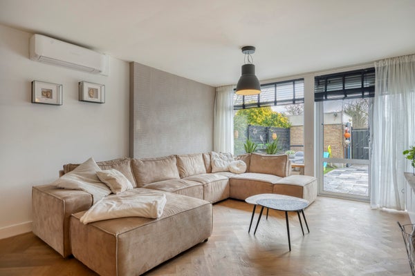 De woonkamer is gelegen aan de achterzijde van de woning en is uitgebouwd en voorzien van een airco. Erg prettig in deze ruimte zijn de grote raampartijen en de woonkamer geeft toegang tot de achtertuin.