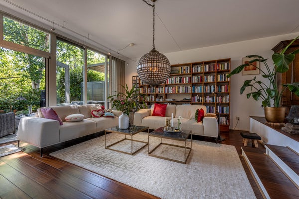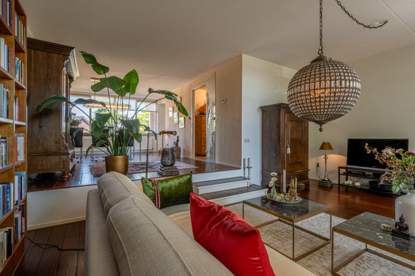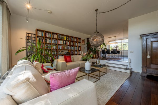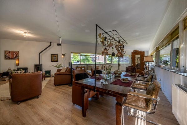 De woonkamer is met recht een living te noemen: een heerlijke, lichte ruimte met hoge plafonds, een warme sfeer en openslaande deuren naar de voortuin. Dankzij de royale afmetingen is er meer dan genoeg plek voor een gezellige zithoek én een grote eettafel voor 8 tot 10 personen. Ideaal voor gezellige etentjes of lange avonden met het gezin.