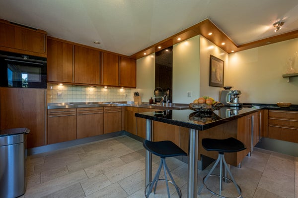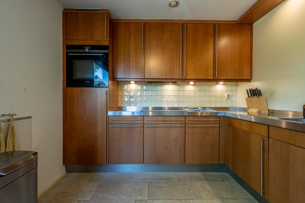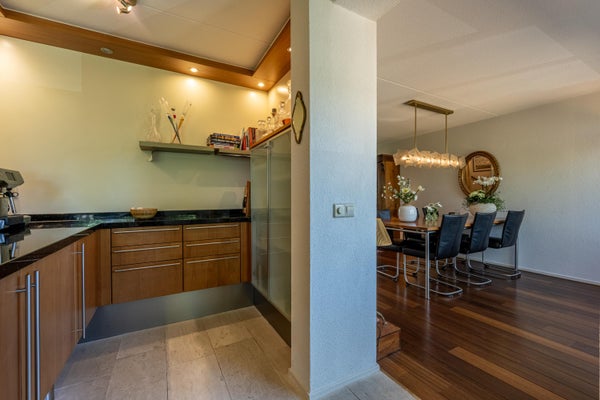 Aan de achterzijde vind je de open keuken, direct grenzend aan het eetgedeelte. De keuken is modern en praktisch ingericht met volop werkblad, veel kastruimte en complete inbouwapparatuur: een koelkast, vriezer, 4-pits inductiekookplaat met afzuigkap, vaatwasser én een Quooker voor direct kokend water.