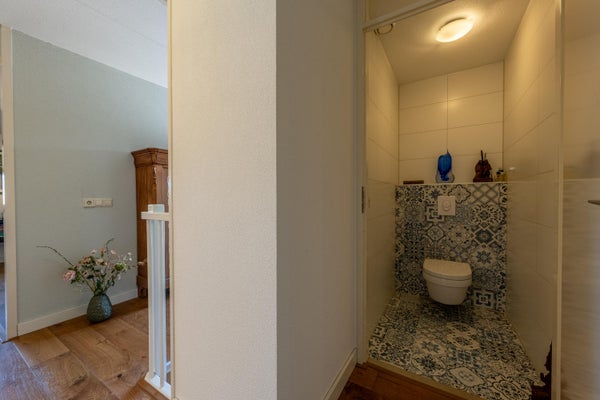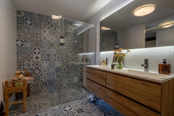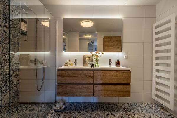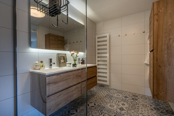 De badkamer is verzorgd en met smaak ingericht. De Portugese patroontegel op de vloer geeft de ruimte karakter, terwijl de witte wandtegels zorgen voor een frisse en tijdloze uitstraling. Je vindt hier een comfortabele inloopdouche met regen- én handdouche, een dubbele wastafel met praktische opberglades én een spiegel.