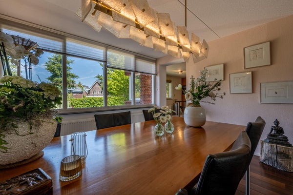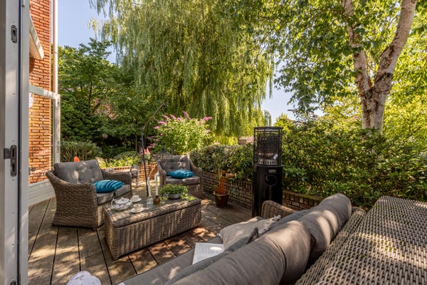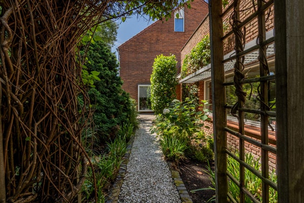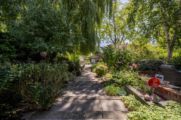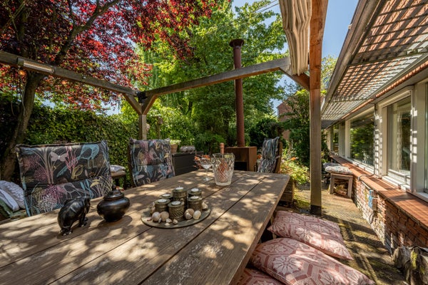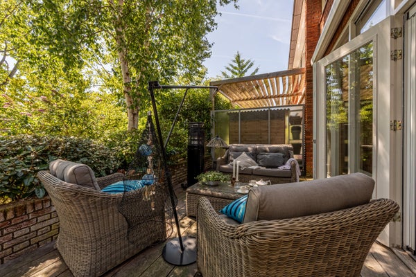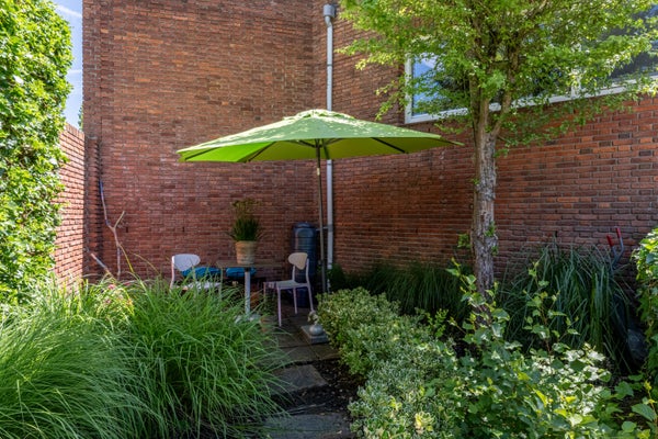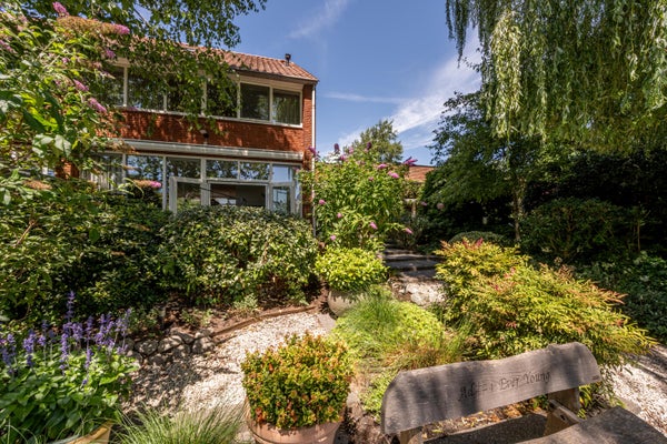 Wat deze woning extra bijzonder maakt, is de fijne buitenruimte rondom het huis. Aan de voor- en zijkant ligt een verrassend ruime tuin met veel privacy dankzij de volwassen beplanting. Hier geniet je van een groene oase, compleet met vijver, meerdere terrassen en volop zon- en schaduwplekken.