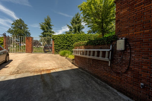 Via een trap in de hal bereik je de ondergelegen garage. Handig als extra opslagruimte: er zijn stellingkasten en er is elektra aanwezig. Vanuit de garage loop je zo de oprit op, waar je ook een laadpaal vindt. Extra fijn: hier zit je heerlijk in de avondzon – een perfect plekje om de dag af te sluiten.