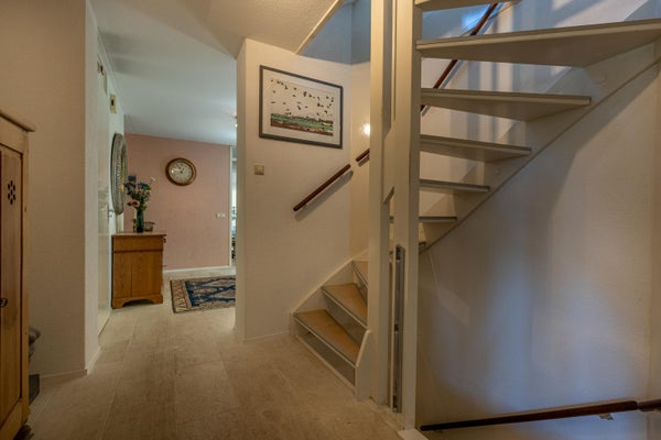 Je komt binnen in de ruime hal met toegang tot het toilet met fonteintje, de meterkast, trap naar boven én de inpandige garage.