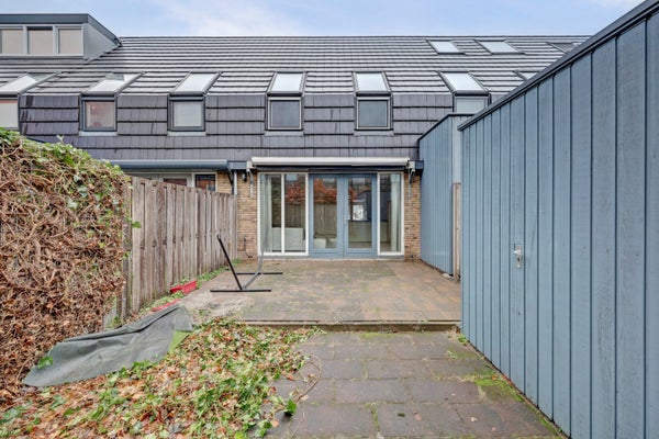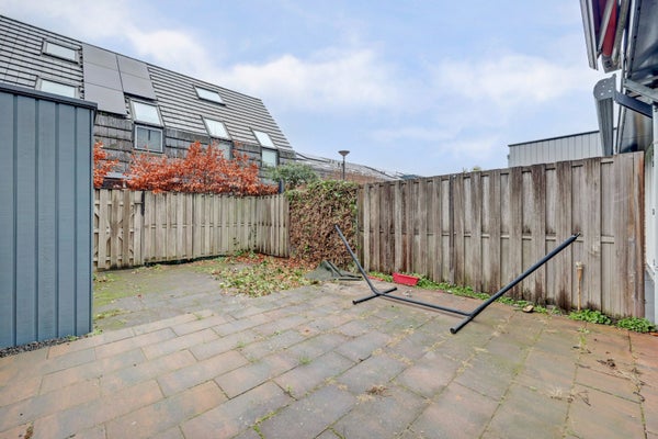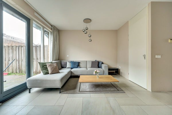 Aan de achterzijde ligt de ruime woonkamer met vaste bergkast en openslaande deuren naar de zonnige achtertuin met zonnescherm, houten berging en achterom. De begane grond heeft een royale living van circa 40 m² en is afgewerkt met een tijdloze plavuizenvloer met vloerverwarming. In de tussenhal bevinden zich het toilet met fonteintje en de trap naar de eerste verdieping.