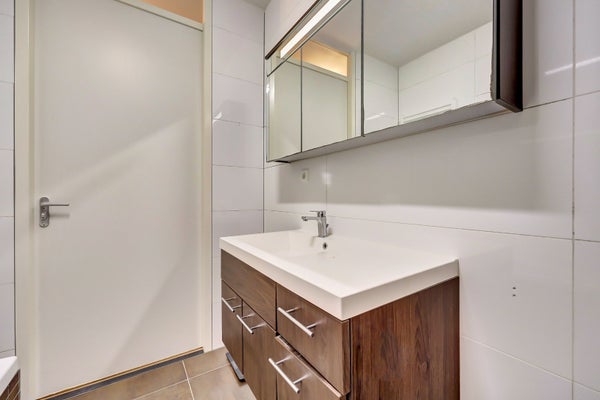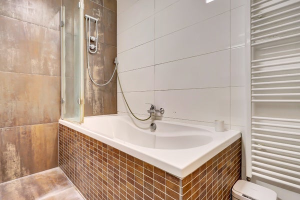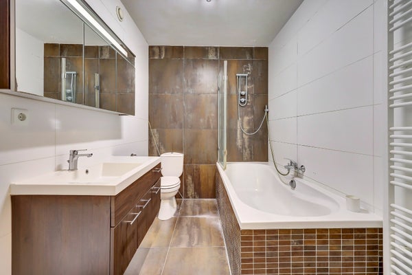 De volledig betegelde badkamer is uitgerust met een ligbad met douchescherm, wastafelmeubel met spiegel en een tweede toilet.