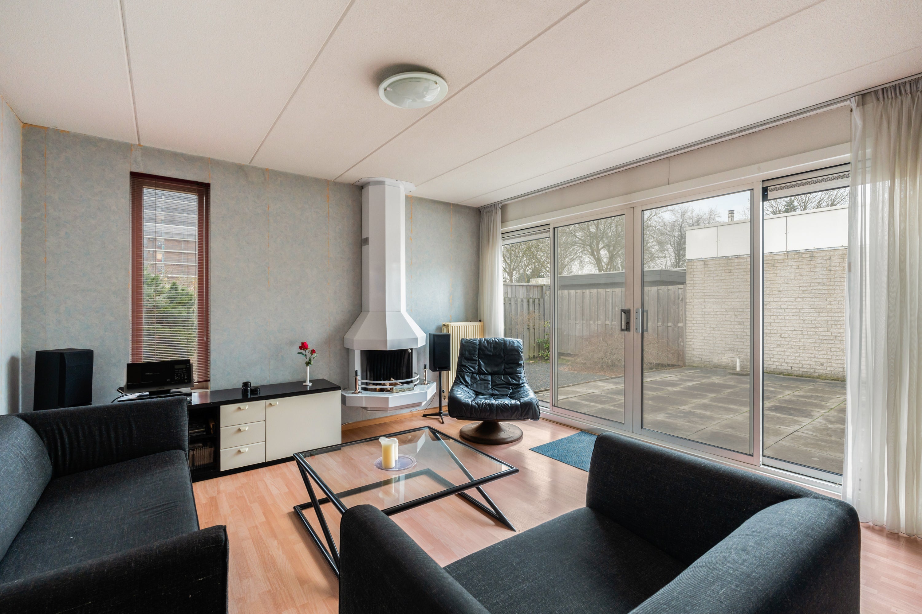 Bij aankomst kom je binnen in een ruime hal die leidt naar de woonkamer en slaapkamers. De lichte woonkamer van 28m2 heeft een grote schuifpui naar de beschutte patiotuin en een houtgestookte openhaard. De tuin van circa 70m2 ligt op het zuiden en is voorzien van terrastegels en borders.
